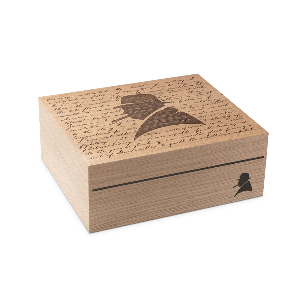 Inspired by Churchill’s gift for storytelling, The Raconteur humidor pairs clean lines with a mirror-effect silhouette on the front and engraved details on the lid.