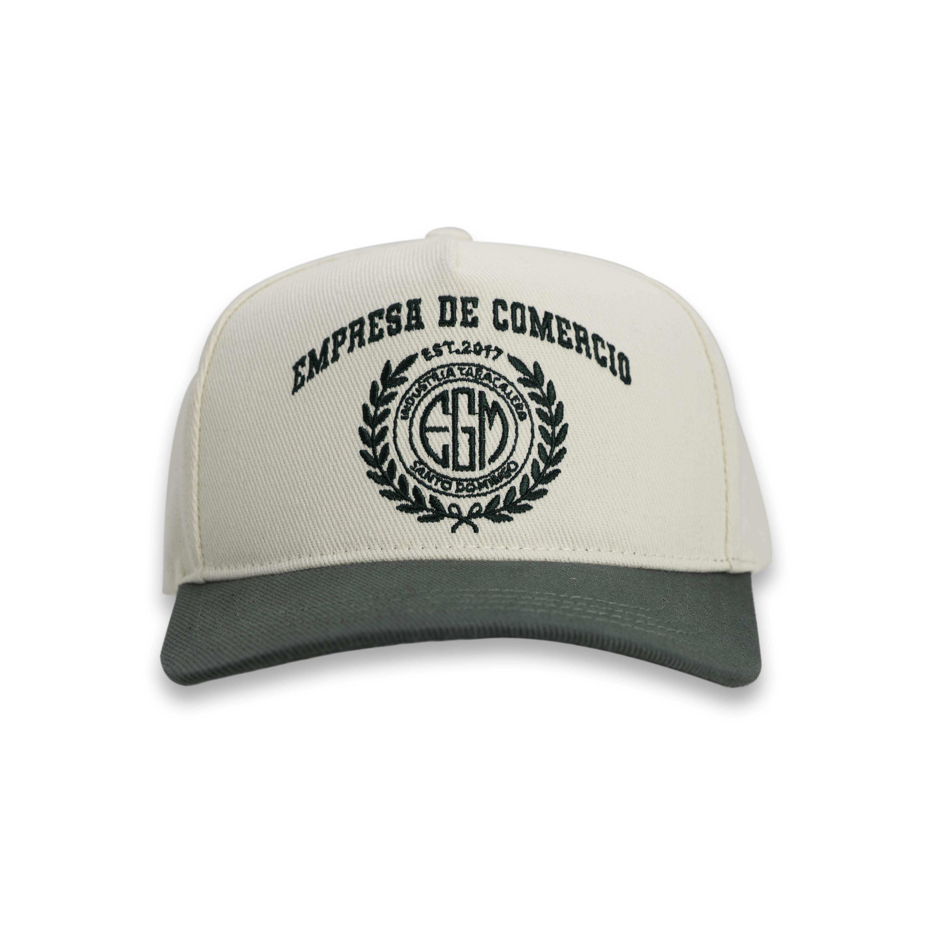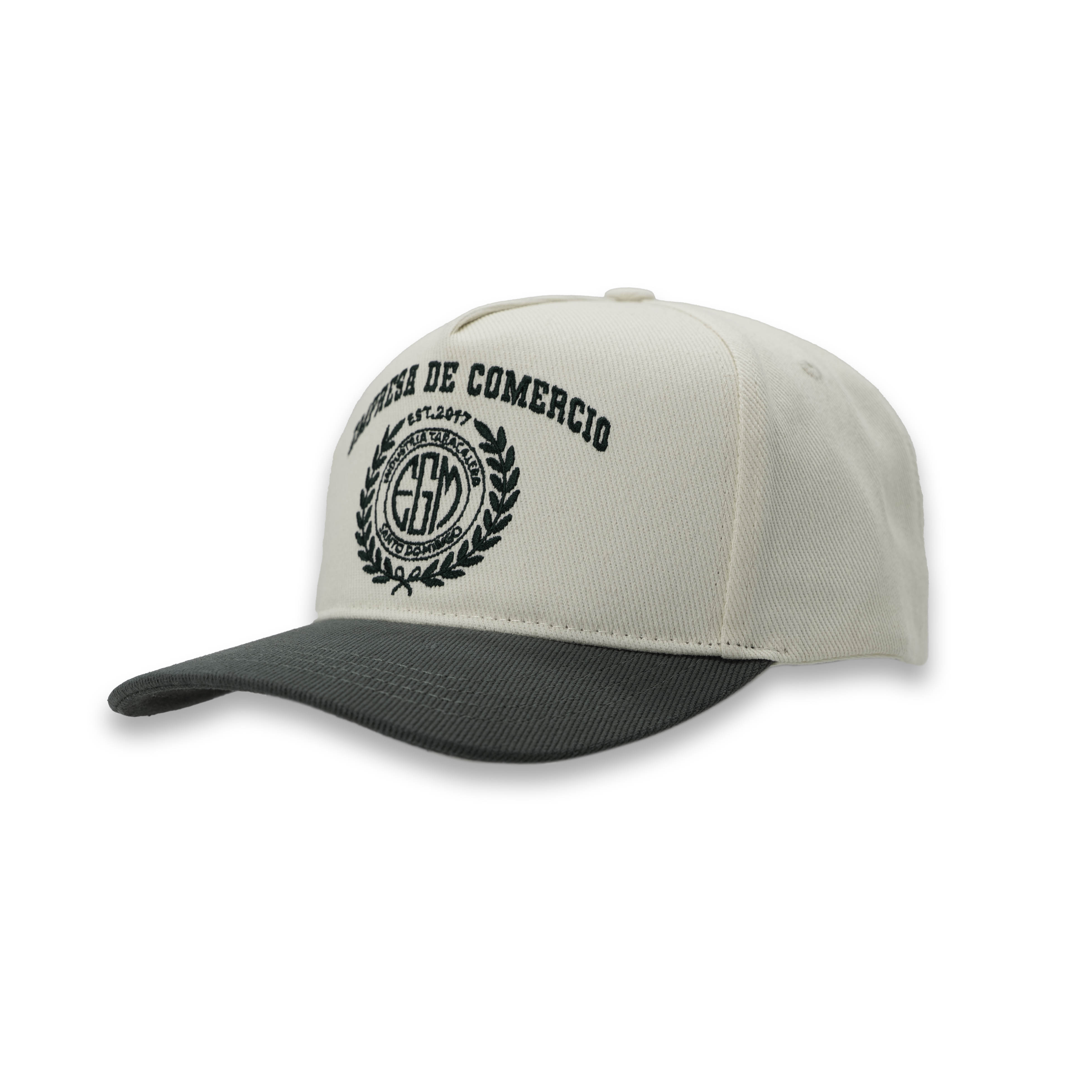 Two-tone cap with “EMPRESA DE COMERCIO” embroidery and a crest on the front.